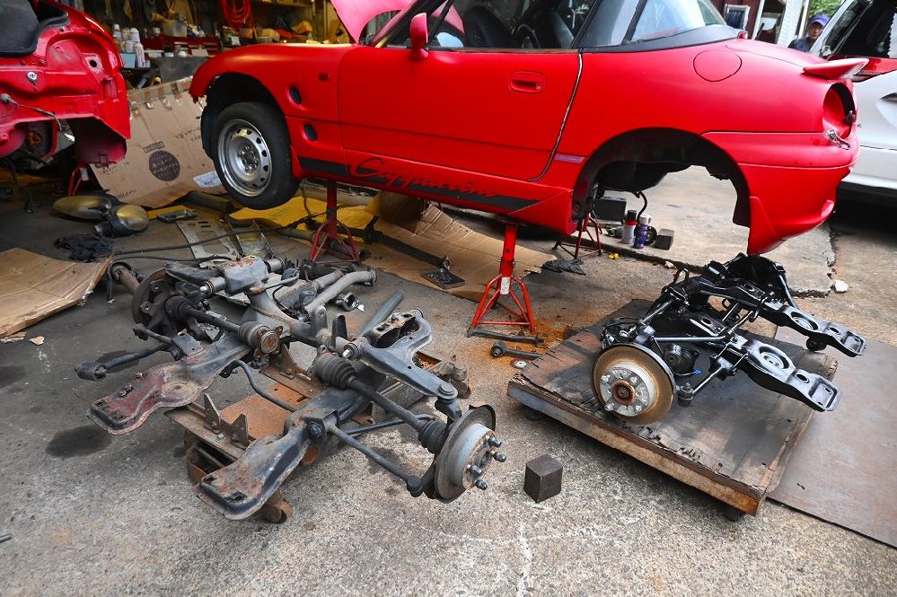 仲間入りした、当時ナンバーのカプチーノ君は、エアバック・ABSが付いています(^▽^;)2台の足回りを並べて確認してもやはり別物です。
