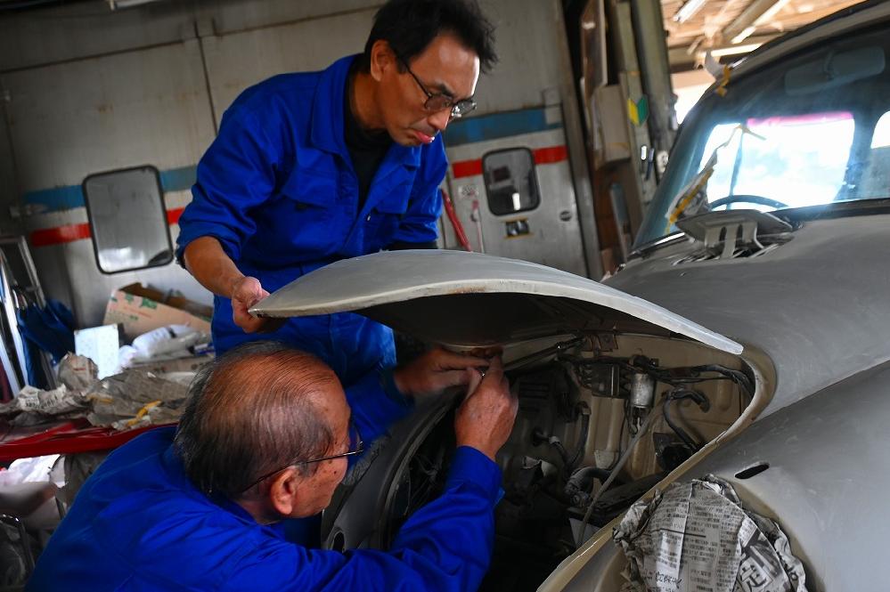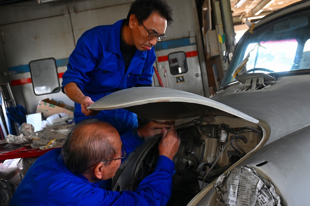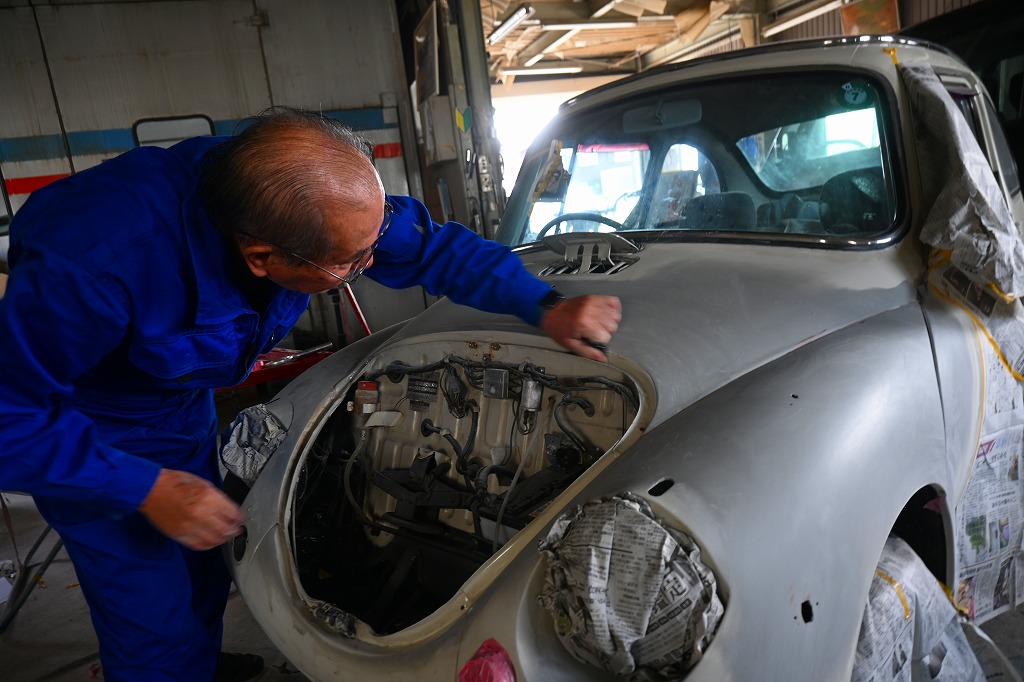 本日も引き続きスバル360君の加修作業を行いました(*^-^*) ボンネット上の空気取り入れ口のダクト回りも綺麗に剥離を行います。 今日は、ジュニア君と一緒にボンネットを外して作業を行いました。 塗装は、ボンネットを外して行います(*^-^*) 熟練マイスターが、ボンネットを外して剥離作業を行いました。 今までに何度か塗装をされていましたが、ボンネットも外さず塗装をされていました(^_^;)