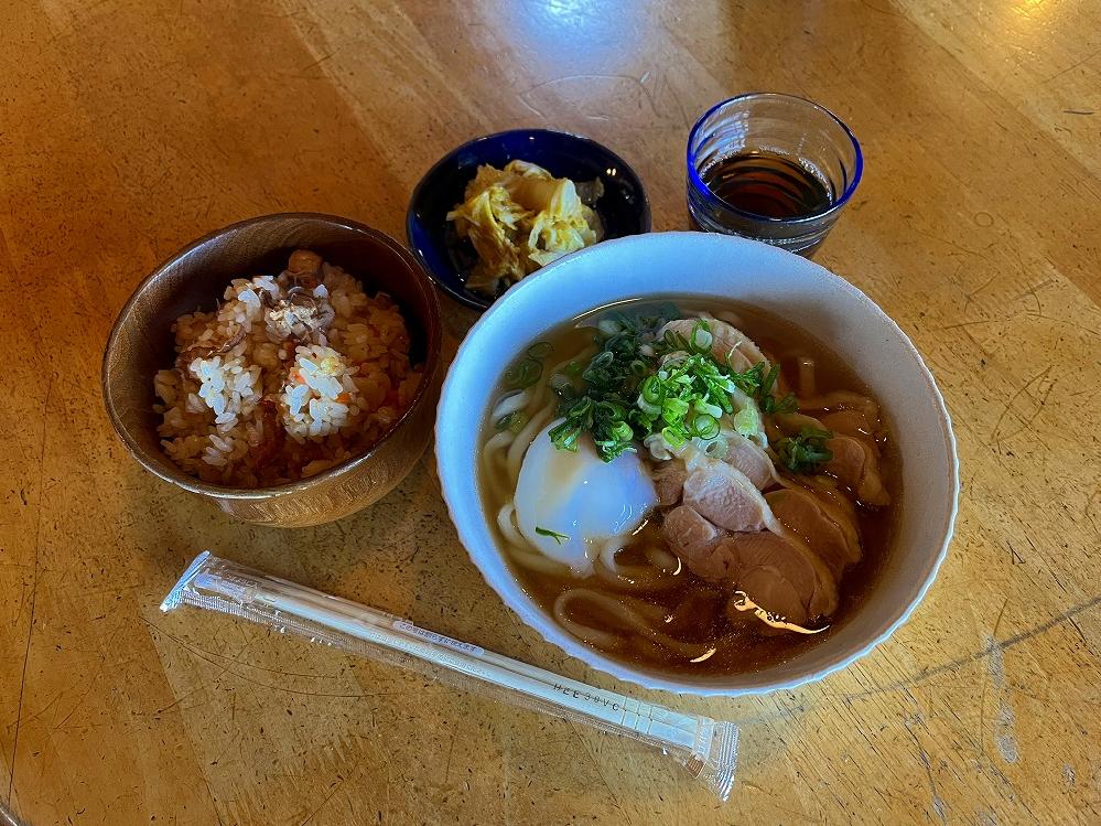 鶏うどん、炊き込みご飯、白菜のお浸しです。