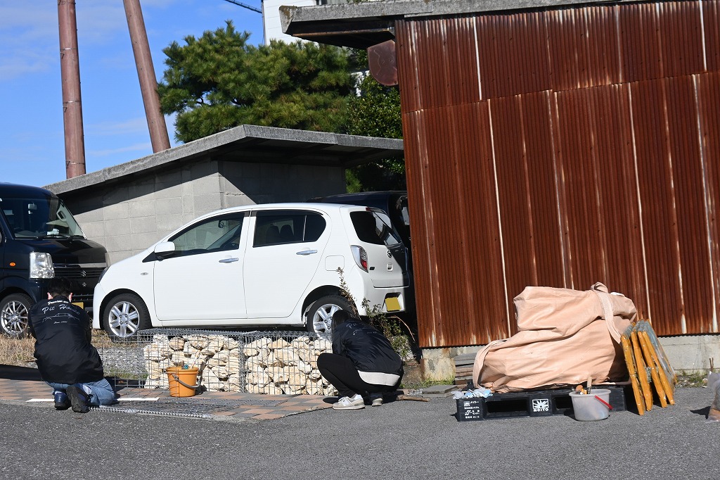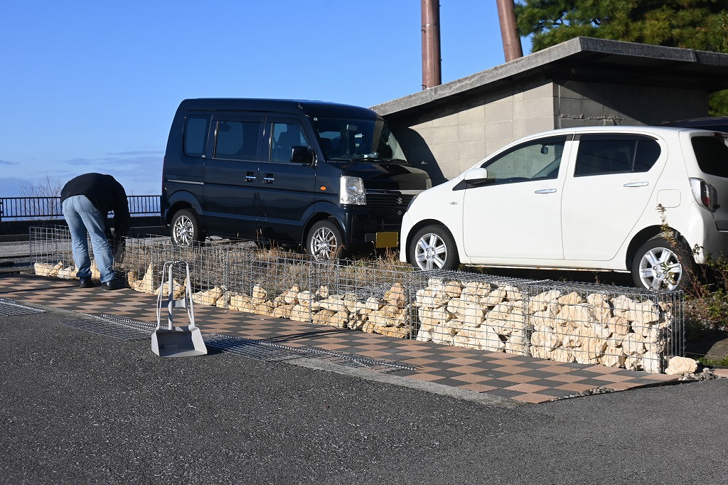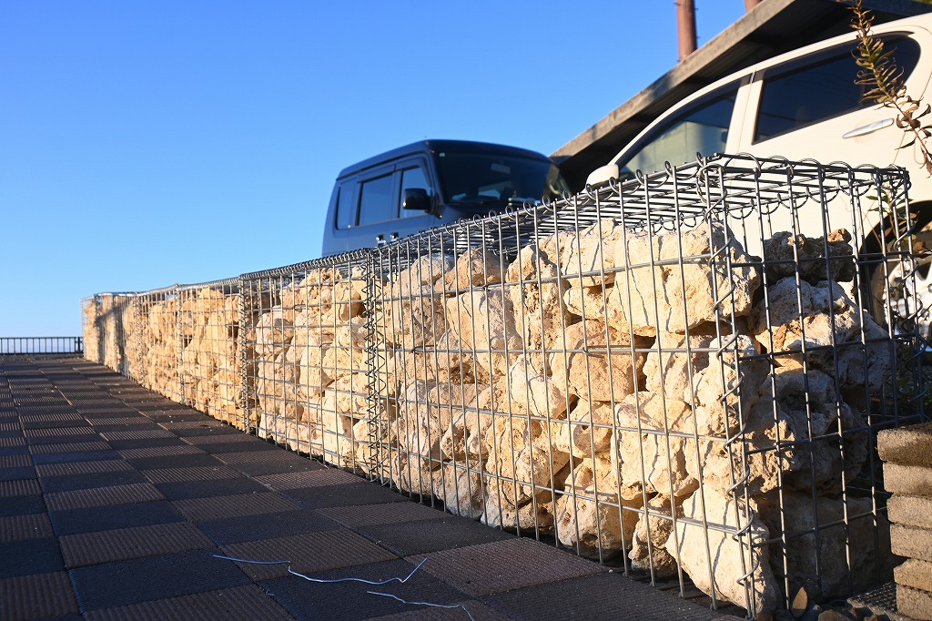 今日は午後から、沖縄の琉球石灰岩を網のネットに入れて、隣の土地の境界線にして行きます(*^-^*)