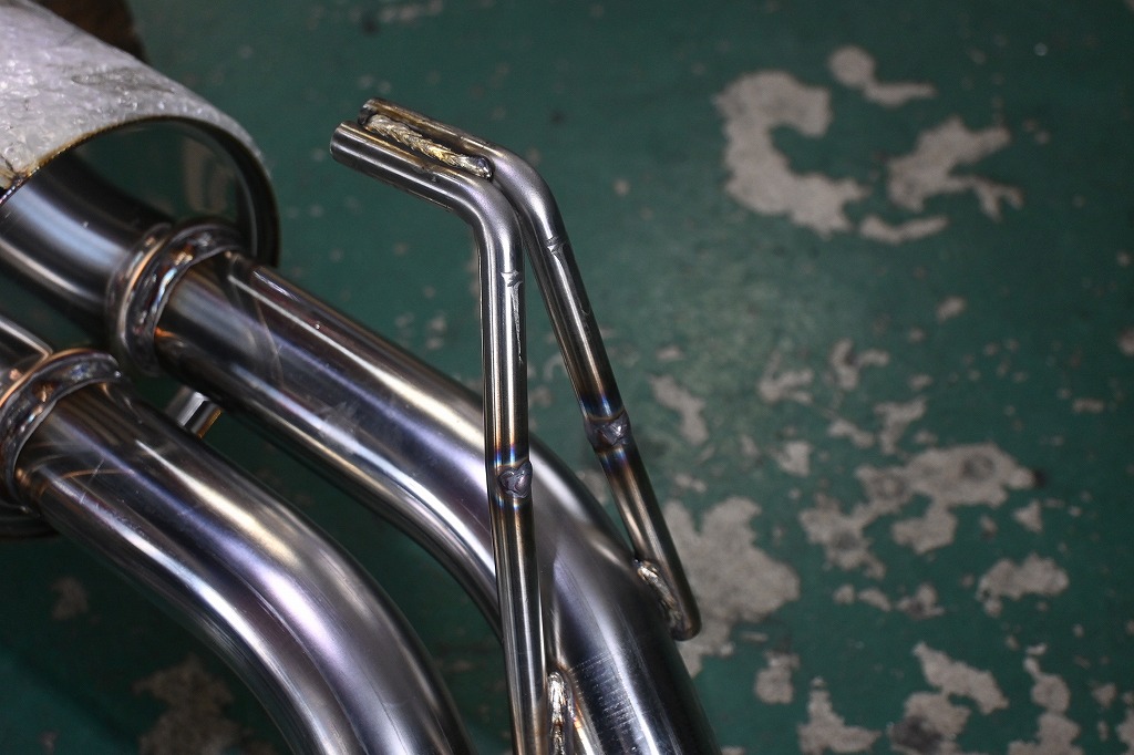 マフラーの取付ステーを切り取り、溶接で角度と長さを調整して行きます。 ミリ単位でステーの角度と長さを変えました(*^-^*) マフラー固定も、少しのミスでマフラーの出口の角度が変わります。 2人で確認しながら位置を決めて行きました(*^-^*)