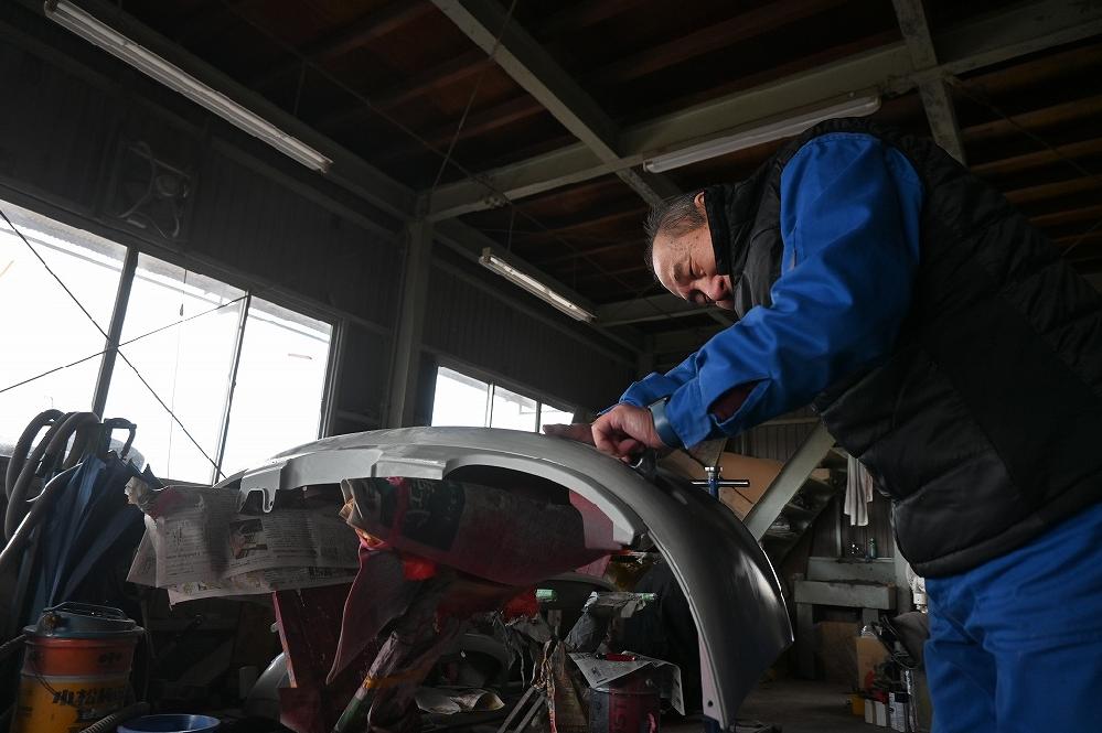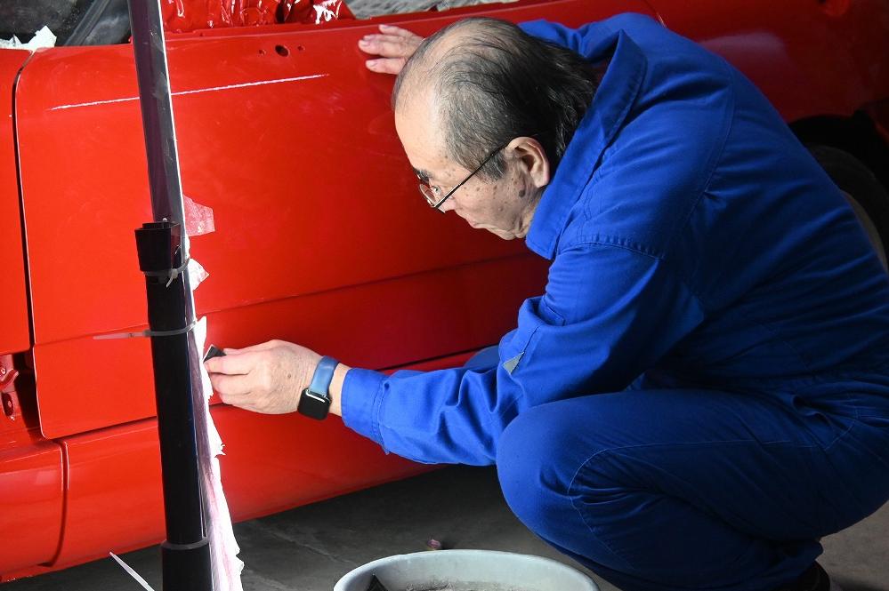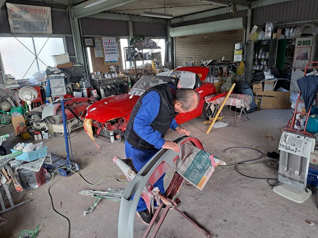 本日の熟練マイスターは、引き続きカプチーノ君のプチレストアの作業を行って下さいました(*^-^*) このフロントスポイラーも、当時の新車から付けられていました。 純正のバンパーも、何度もサフェーサーを吹付けて飛石の傷や歪を抜いて行きます(*^-^*) ゴミかみがないか細かく確認して行きます(*^-^*) 熟練マイスターは、軽スポーツの塗装も妥協をしません。