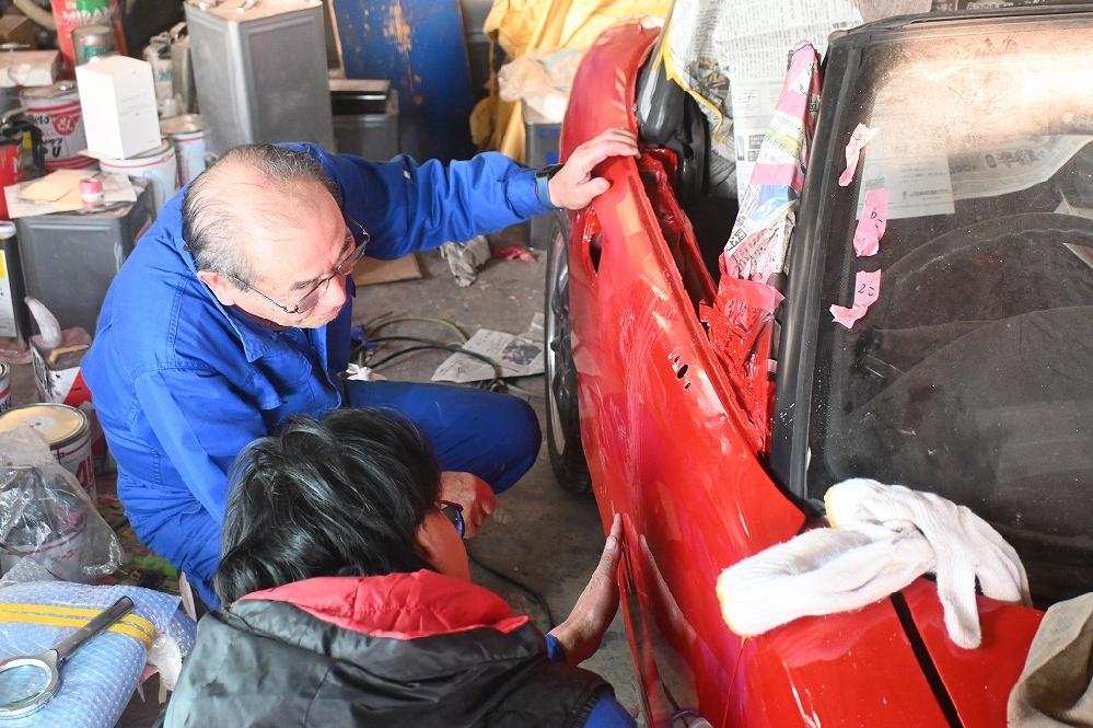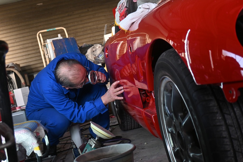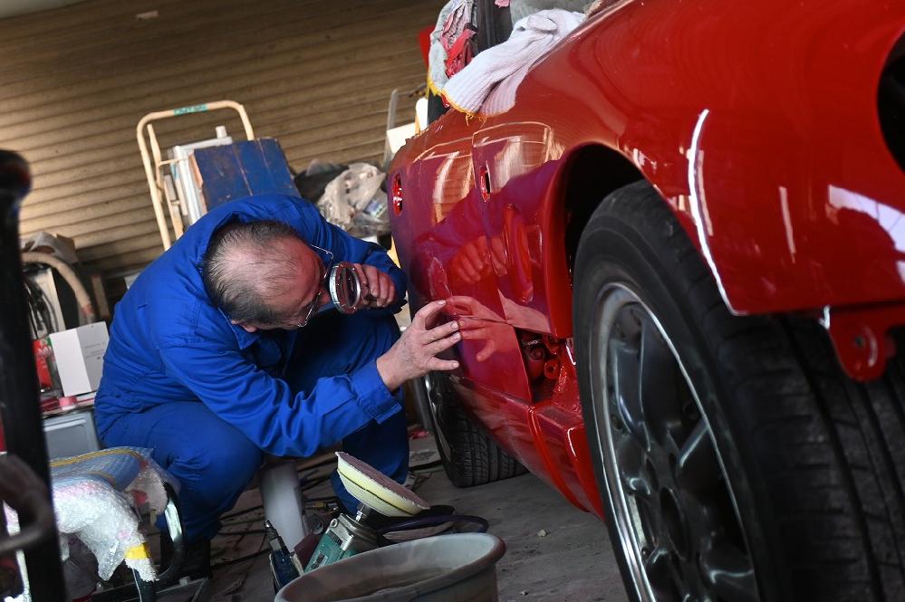 午後の作業を見に行くと熟練マイスターが、ルーペを使い塗装の表面を確認していました。