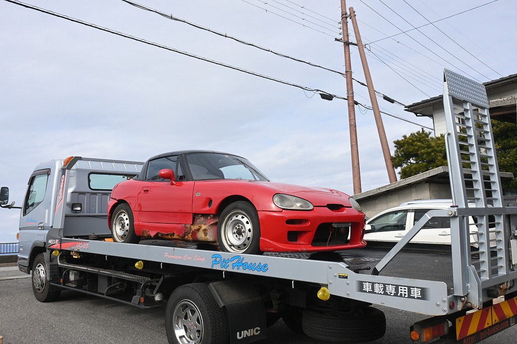 本日は、朝一番に部品取りのカプチーノ君を鈑金工場に運びました。 現在製作中のカプチーノ君にパーツを使います。 鈑金工場から、一台カプチーノ君を店に運びます。 このカプチーノ君は、13年前に亡き息子の為に僕が作ったカプチーノ君です。 時間が止まっています。 一度、店に運んで保管します(*^-^*)