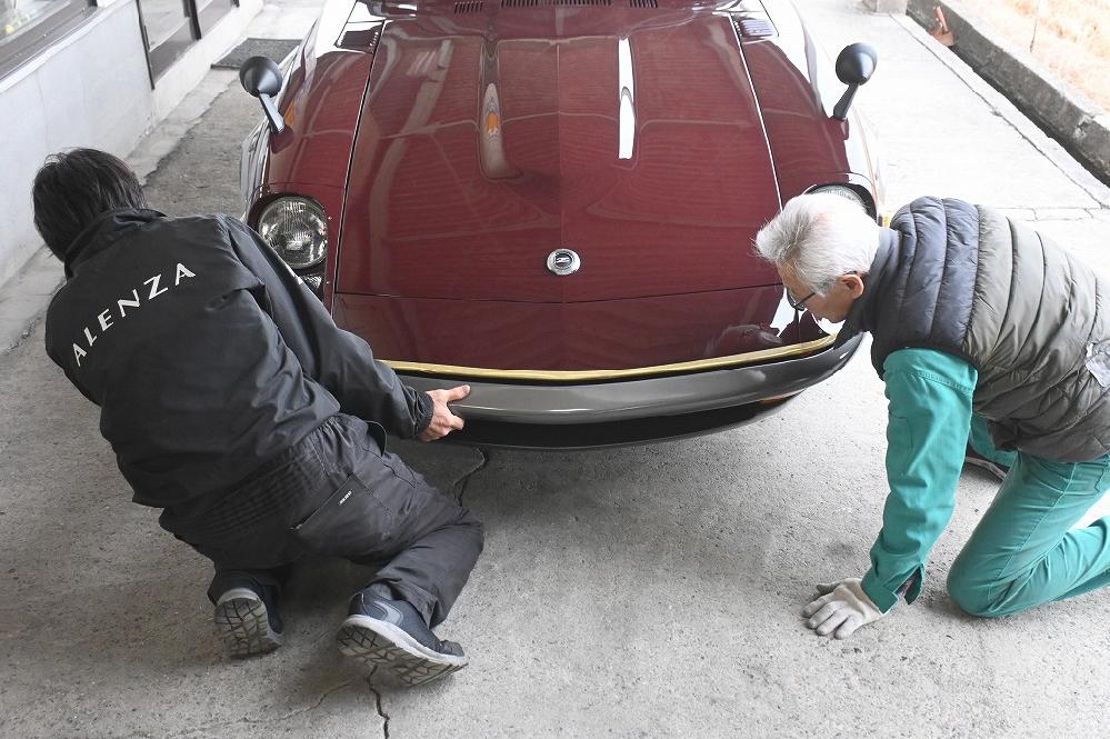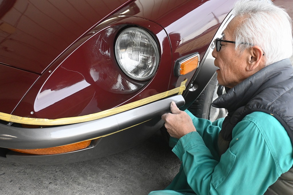 愛知240ZG君のバンパー塗装が終了しました(*^-^*) 凄く綺麗の仕上げりました(*^-^*) 工場長と師匠が、固定のボルトをネジ切で綺麗に仕上げて行きます。 師匠と工場長が、慎重に作業を進めて行きます。 樹脂のバンパーは、凄く柔らかく少しの捩れでも塗装にヒビが入ります。 何と(;゚Д゚)師匠がバンパーをはめ込み、裏ネジで固定して行くと。 (;゚Д゚)指の力で塗装にヒビが入りました(^_^;) ZGの弱点で樹脂バンパーの固定は、本当に難しいです(>_<) 再度、最初からやり直します。 オーナー様、もう少お待ち下さいね。