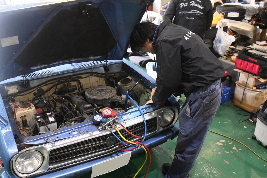 このサニートラック君にはクーラーが付いています(*^-^*) このクーラーも凄く希少です(*^-^*) ガス漏れ点検とガス補充を行いました(*^-^*) 元気よくコンプレッサーが回りました。 この季節は外気温が低く、冷たさが分かりにくいですね(^-^)