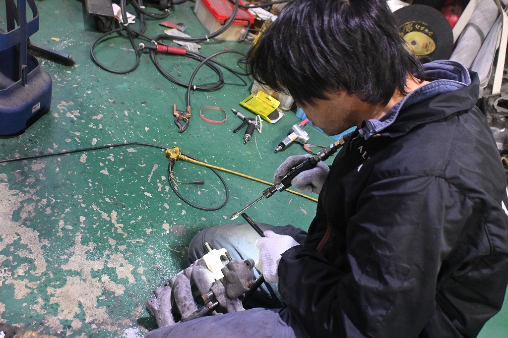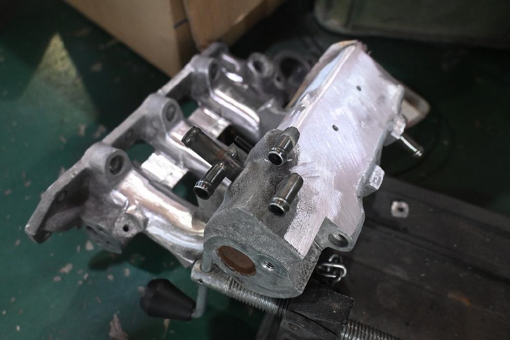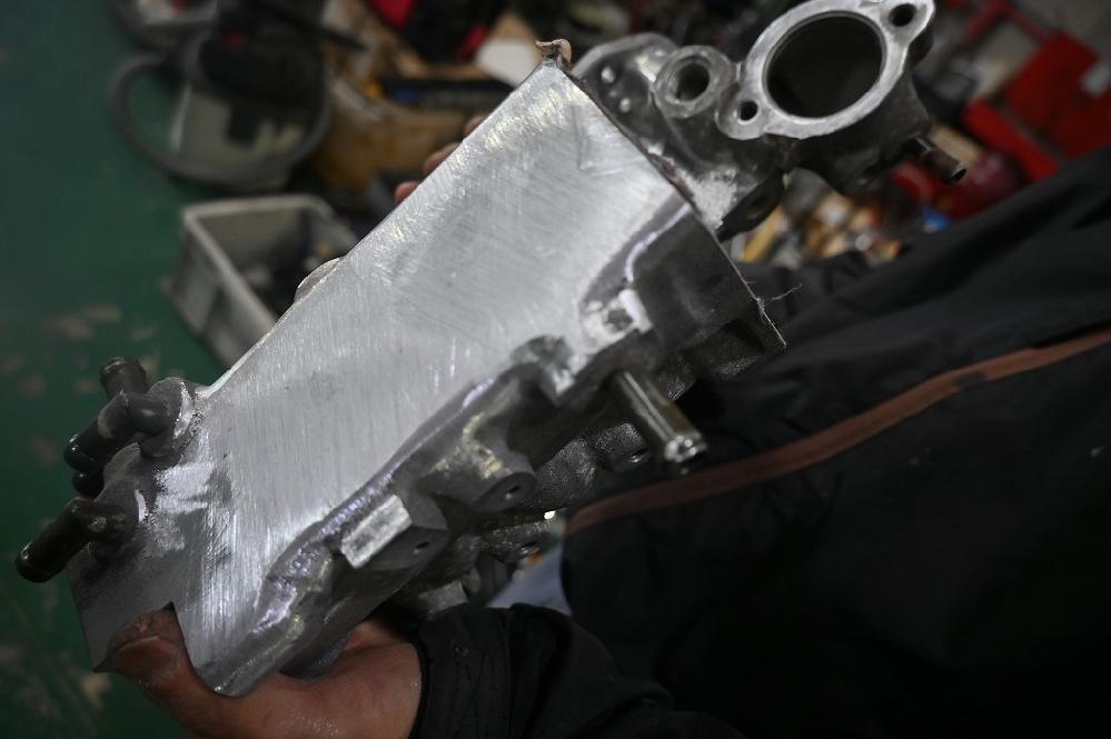 工場長が、時間の合間に今日もデモカーカプチーノ君のサージタンク加工を行って下さいました(*^-^*) 純正の配管を抜いて穴をアルゴン溶接で埋めて行きます。 アルゴン溶接で穴を埋めて溶接面を削り取りました(*^-^*) この部分は、鏡面まで磨きます(*^-^*) サージタンクの中も大きく加工して行きます(*^-^*) 空気の抵抗になる出っ張りを削り取りました(*^-^*)