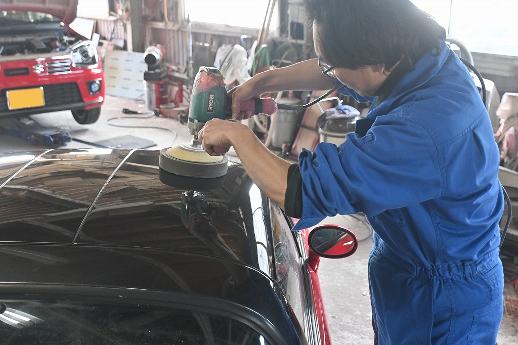 ジュニア君が磨き作業を行って下さいました(*^-^*) ルーフも綺麗に光沢が出ました(*^-^*) 引き続き組付け作業に入ります(*^-^*) バックパネルもよく見て下さい(*^-^*) 事故なしの綺麗なボディです。 購入希望があるお客様は、参考に見て下さいね。