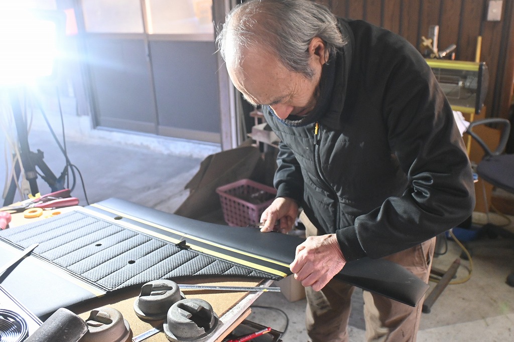 本日は、ピットハウスの内装工場の作業を見に行きました(*^-^*) 現在、鳥取ハコスカGTR君の内張製作を行っています。 純正の柄を使い純正新品の内張りに作り替えていきます。 熟練のマイスターが手作業で作って行きます。 新品のモールです(*^-^*) 純正と同じ様に接着面を高温の鏝で押し潰しています。 見た目も純正と同じ形状に復元して行きます。 水切りモールの毛も純正と同じ様に復元しています。 この作業も熟練マイスターの拘りの作業です(*^-^*) オーナー様、楽しみにお待ち下さいね。