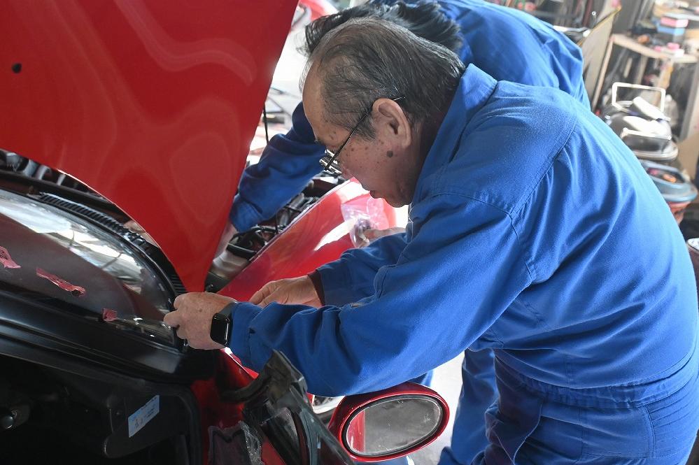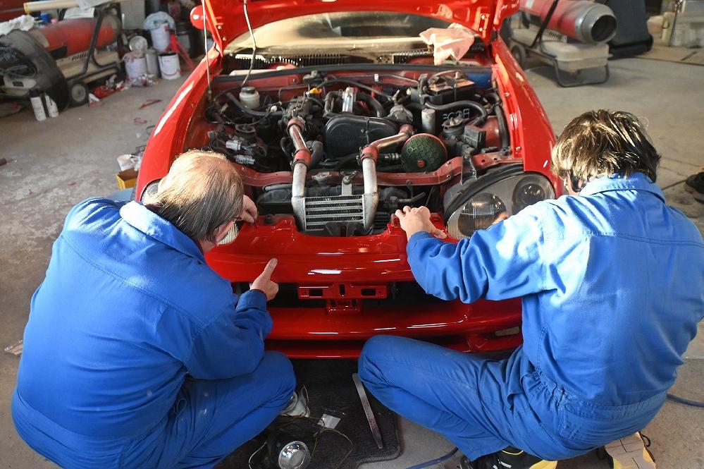 プチレストアで綺麗に仕上げたカプチーノの組付け作業に入りました。 カウルトップパネルも新品のピンに交換して固定して行きます。 フロントバンパーのスポイラーを固定しました(*^-^*) 当時の新車から着けられていたスポイラーです。 経年劣化で少し硬くなっていますね(^▽^;) 取付けも慎重に作業を行いました(^-^) 当時から着いていたフォグランプを着けるか思案ですね(^▽^;) 当時は、32GTRの純正オプションに似たフォグランプが流行っていました(*^-^*)