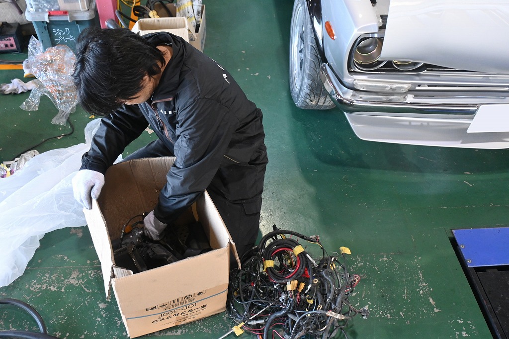 工場長が組付け準備を行いました(*^-^*) 今日は、スタッフ皆で作業の確認作業を行いました。 工場長が、大切に保管していた純正ハーネスを箱から出して行きます。 この子も配線を引き直さないとダメですね(^▽^;) エンジンを出して来ました(^_^;) 今回は、エンジンのオーバーホールを行わないので綺麗に化粧直しを行います(*^-^*)