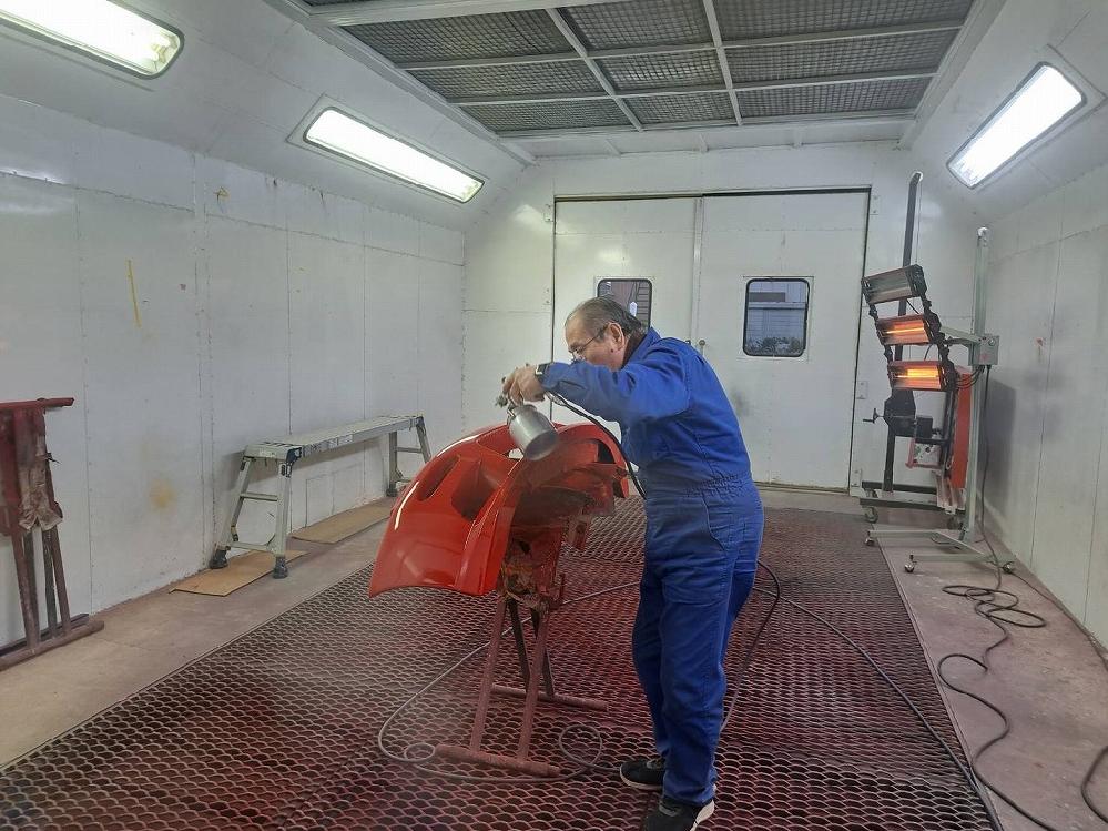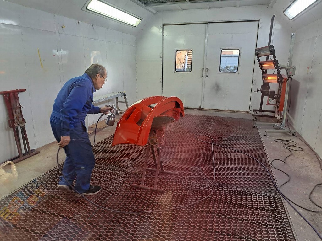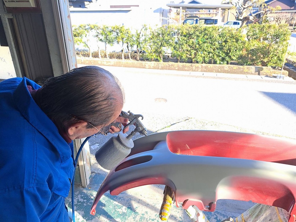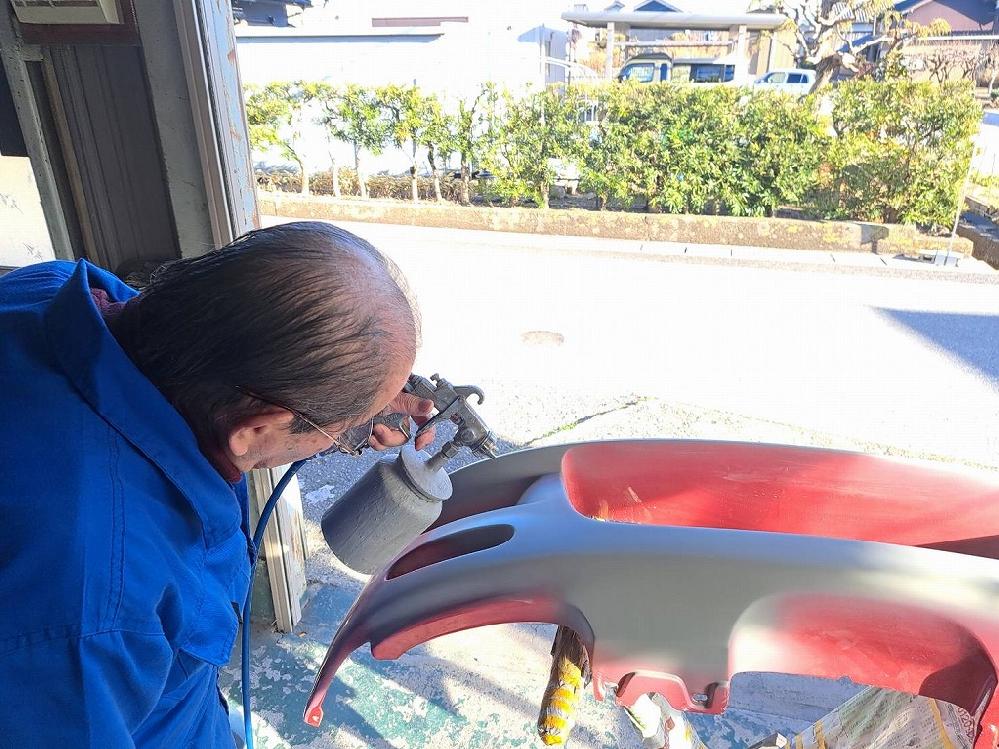 本日の熟練マイスターは、引き続きカプチーノ君のバンパー修理を行って下さいました(*^-^*) 今回は、店頭でのアクシデントでバンパーに亀裂が入りました(^▽^;) 午後から塗装を行って下さいました(*^-^*) 下地の塗装も3層に分けて吹付けて行きます(*^-^*) 最終にクリア塗装を吹付けて下さいました(*^-^*) これでバンパーも綺麗になりました(^-^)