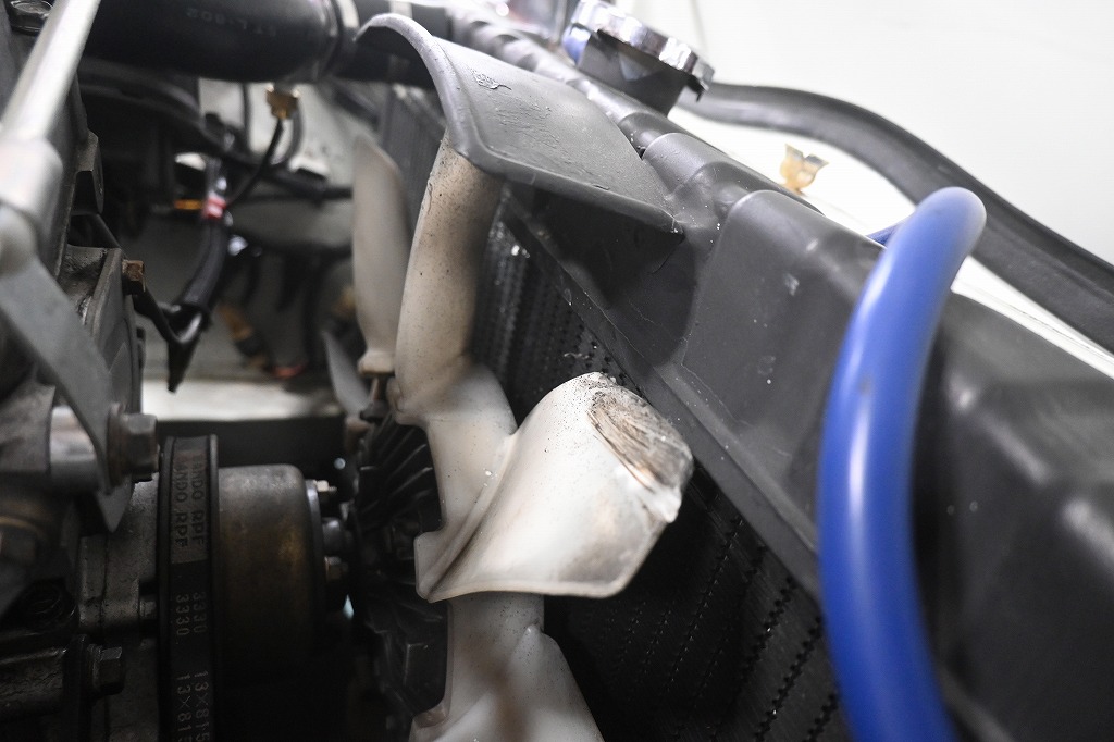 何と(;゚Д゚)カップリングファンが、ラジエターと接触しています(^▽^;) これは、少し危険ですね(^▽^;) ラジエターが、カップリングファンで削れていました(゚Д゚;) 何と(;゚Д゚)マフラーが、加工されていました(^▽^;) これでは、片側の排気が半分になり、キャブ調整もまともに出来ません。 この加工は、ユーチューブで紹介されていましたが、最近のお店さんは、ユーチューブを見過ぎですね(^▽^;) 専門店では、この様な加工を行いません。
