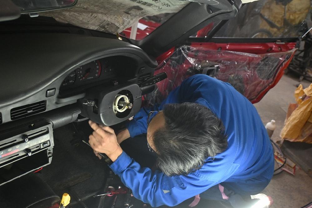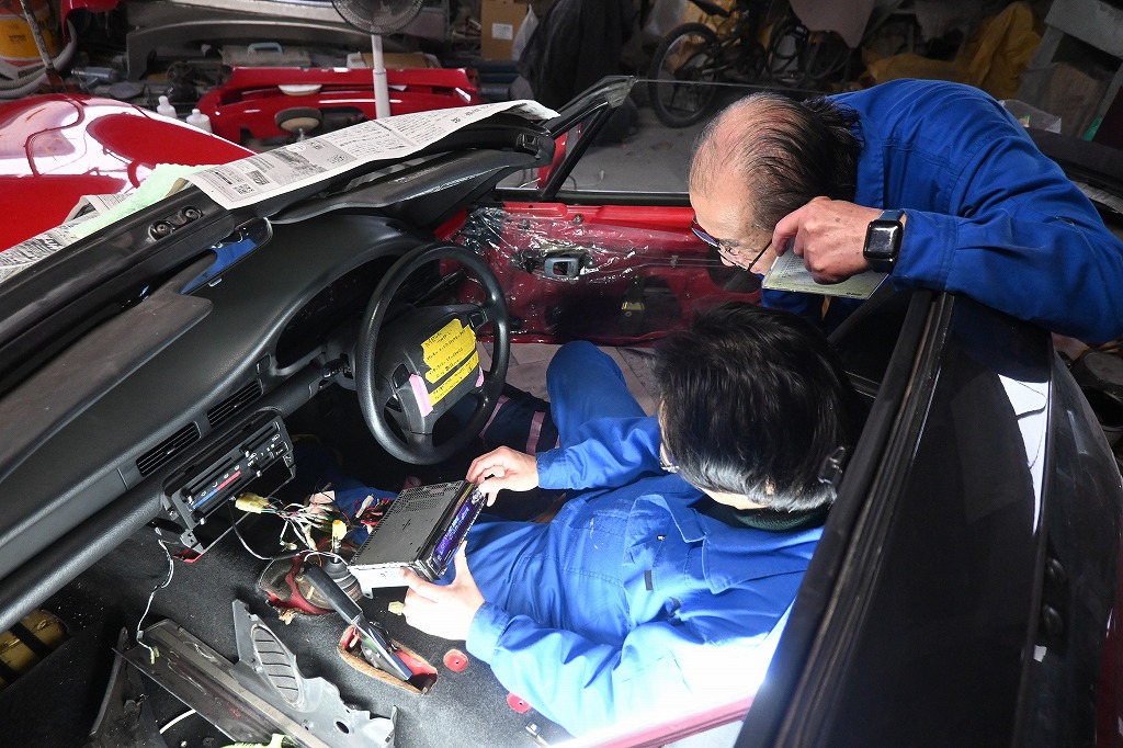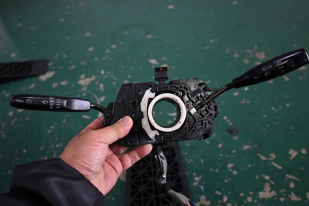 現在、製作中のカプチーノ君のハザードランプ修理を、工場長が行って下さいました(*^-^*) 経年劣化でスイッチのプラスチックに亀裂が入っていました。部品取りの車両からパーツを外して修理を行いました。 ジュニア君が、装着して下さいました(*^-^*) これでハザードランプのスイッチも修理出来ました(*^-^*) オーディオの電源を入れて作動確認を行いました。 何と(;゚Д゚)アンテナワイヤーの先が経年劣化で欠落していました。 (^_^;)アンテナを外して付け替えます(^_^;) この作業は、凄く大変です(^▽^;)