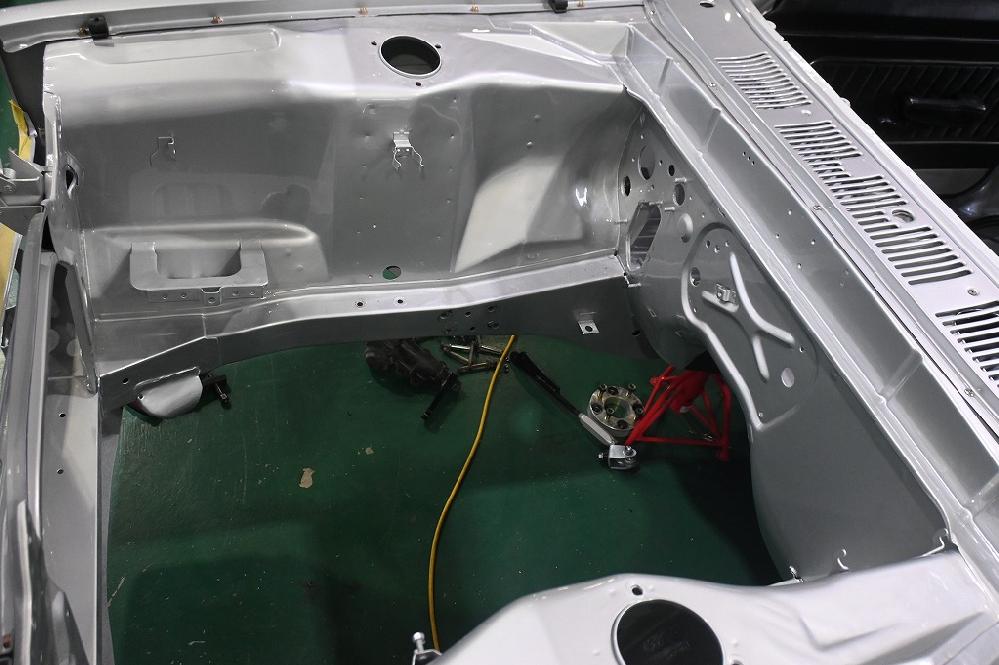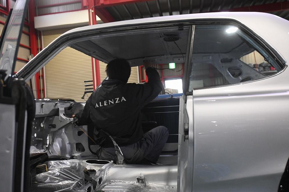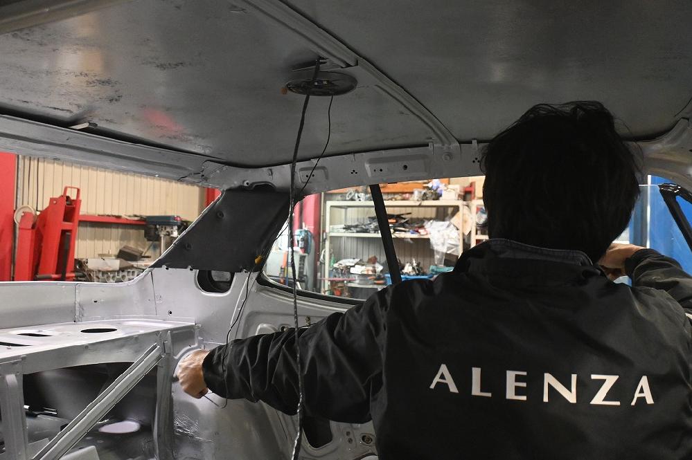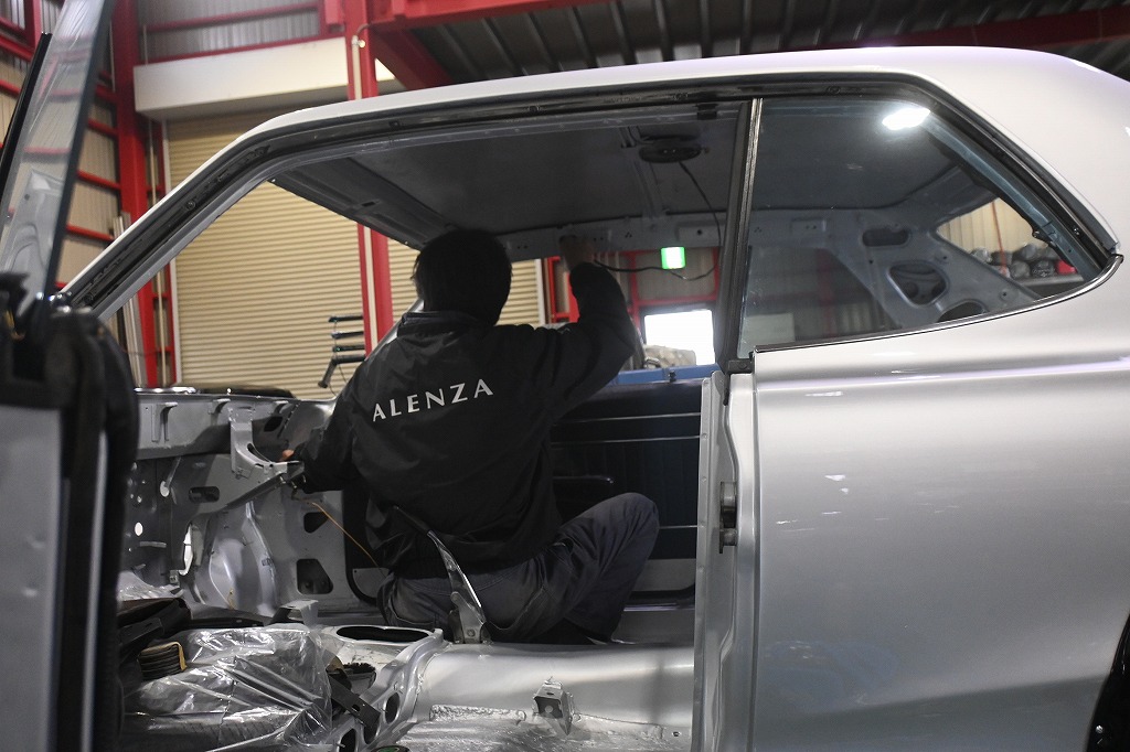エンジンルームのパーツを全て外しました(*^-^*) エンジンルームも綺麗に仕上げます。 引き続きルームライトの配線引き直し作業を行いました。 経年劣化の配線は同時に新しい配線に交換します。 天張りを固定する前に配線をフレーム内部に通して行きます。 この配線でドアの開閉時にルームランプが点灯します。