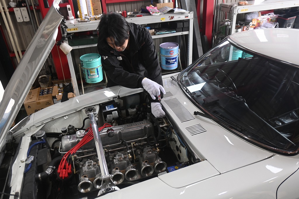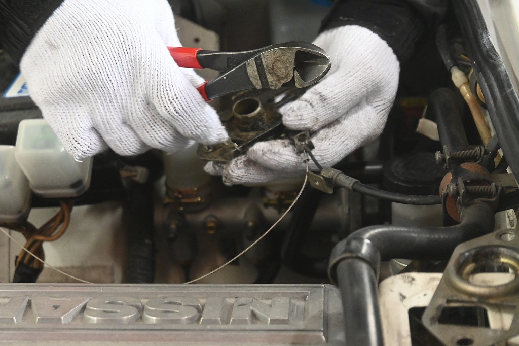 本日は、倉庫に滋賀S30Z君のお迎えに行きました。 今回は、フルレストアを行う前に車両を点検・確認させて頂きました。 今日は、S30Z君の修理を先に行わせて頂きました。 フルレストアの予定は、12月から一年を予定しています。 12月まで安心して乗って頂ける様に整備を行います。 何と(;゚Д゚)ボンネットが開かないので、確認するとボンネットワイヤーが加工されていました(^▽^;) 旧車を知らない方がメンテナンスをされていた感じです(^_^;) ボンネットのキャッチがワイヤーで動かないと思い、細いワイヤーを加工して付けられていました(^▽^;) これでは、ボンネットが開きません(^▽^;)