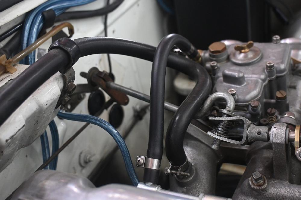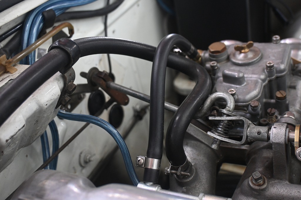 アクセルリンケージがバキュームホースと燃料ホースに接触しています。