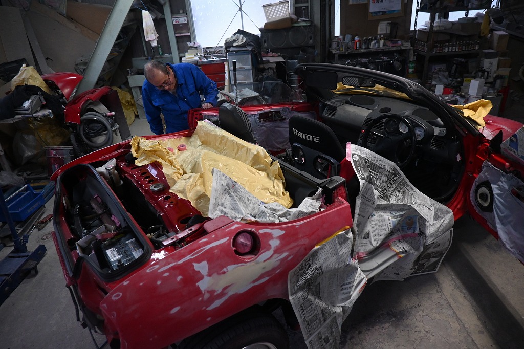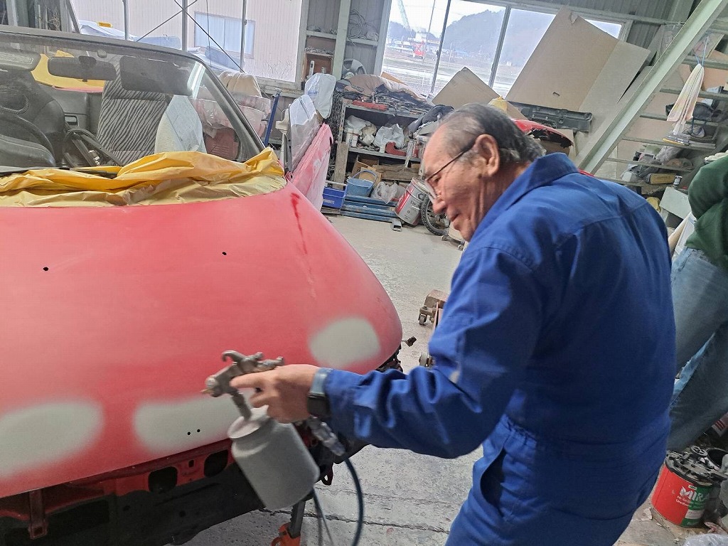 本日の熟練マイスターは、赤ビートU君のプチレストアを行いました。 今日は、鈑金で修理を行った部分にサフェーサーを吹付けて行きます。 ボンネットは、飛石で3カ所小さな凹みが隠れていました。 腐食穴修理を行ったステップにサフェーサーを吹付けました(*^-^*) ビート君の弱点は、やはりステップの腐食錆びですね(^▽^;) ボンデ鋼板を使い、綺麗に修復しました。 熟練マイスターは、細かく確認を繰り返し綺麗なボディに仕上げます(*^-^*) オーナー様(*^-^*)楽しみに見ていて下さいね(*^-^*)