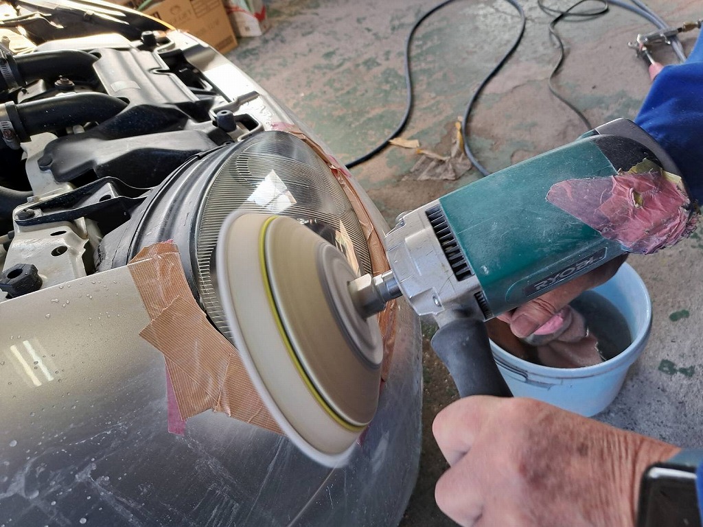 何と(;゚Д゚)熟練マイスターとジュニア君が、三重カプチーノ君のヘッドライトコーティングを行って下さいました。 表面の汚れと古いコーティングを削り取って行きます。 ヘッドライトの表面を微粒子のコンパウンドを使い、小さな小傷も綺麗に削り取って行きます(*^-^*) 最終にハードコートを行いました(*^-^*) 以前のコーティングと違いハードコーディングは、飛び石にも強く長く美を保ちます(*^-^*) オーナー様(*^-^*)この作業も車検整備です(*^-^*)