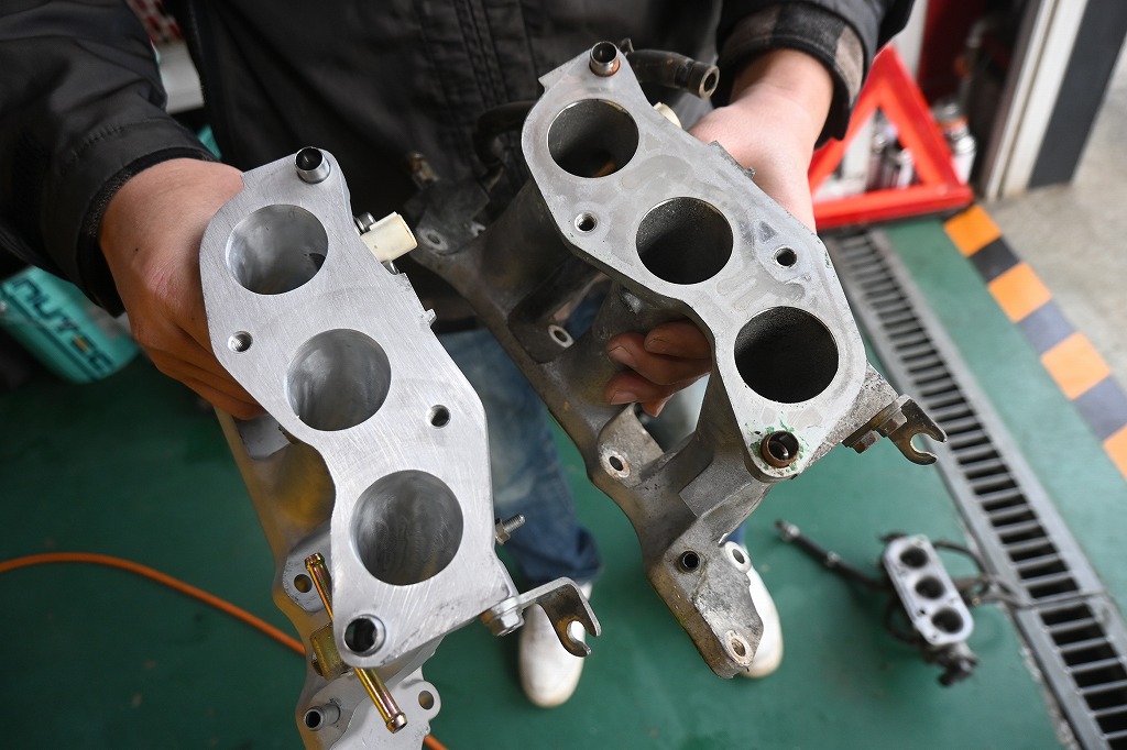 本日も引き続き、石川ビート君のオイルパン交換を行いました(*^-^*) オイルパンを交換しました(*^-^*) RSマッハさんの大容量オイルパンに交換しました(*^-^*) これで油温も下がり、夏場の高速走行も安心して走れますね(*^-^*) インテークマニホールドも交換しました(*^-^*) ポート研磨も行い、空気の流れも良くなります(*^-^*) スロットルボディも同時に交換するので、エンジンのレスポンスも良くなります(*^-^*)