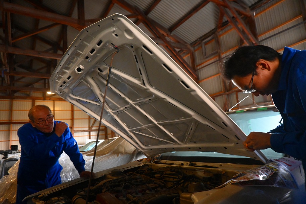 ピットハウスの倉庫に熟練マイスターとジュニア君と3人でボンネットを外しに行きました(*^-^*)