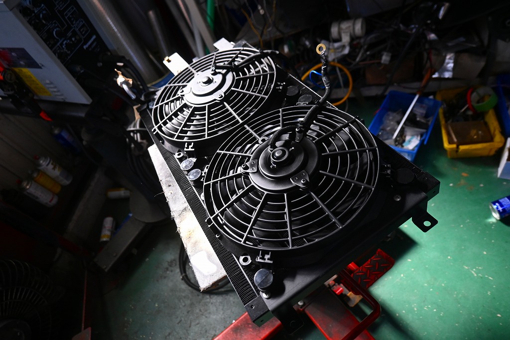クーラーコンデンサーと電動ファンを固定しました(*^-^*)