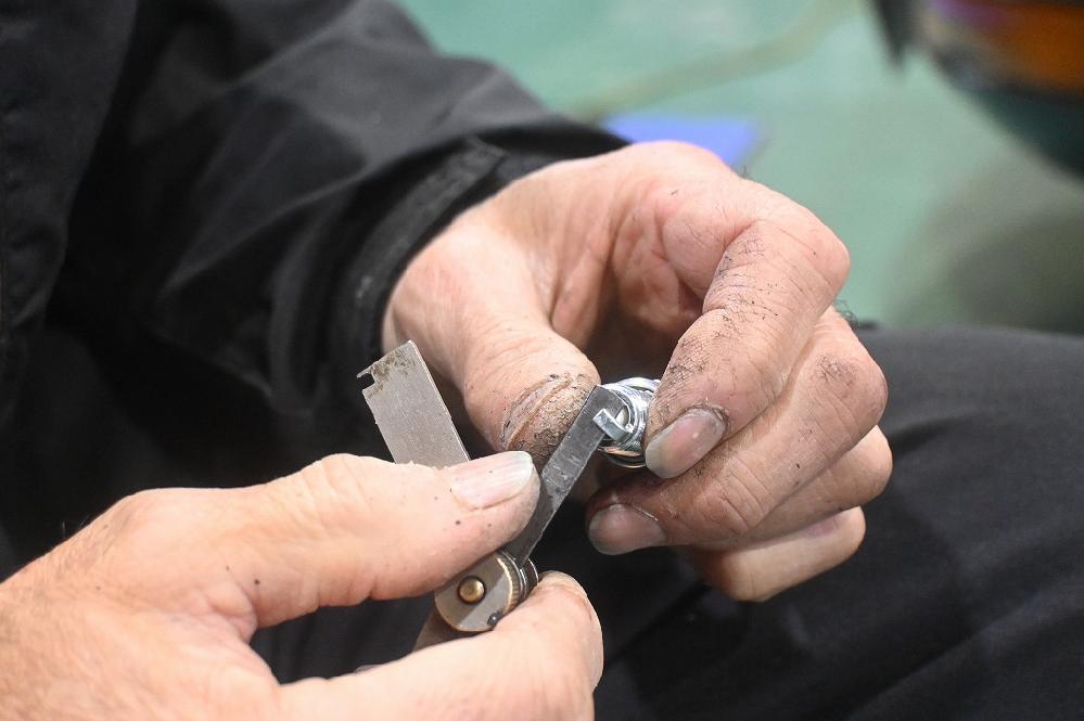 工場長が、プラグの隙間を調整しながら開けて行きます。