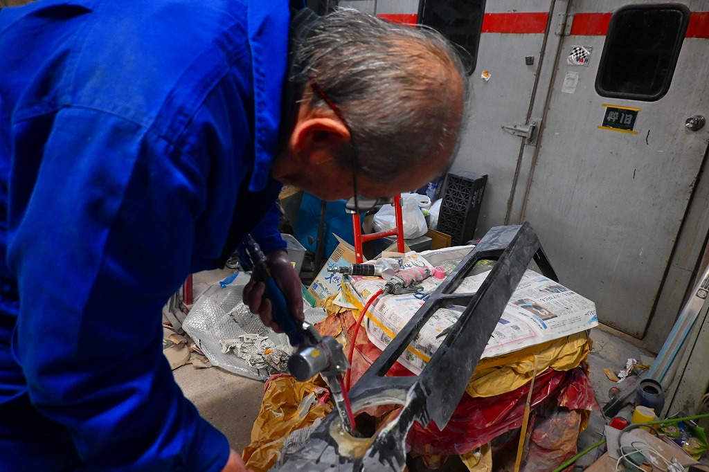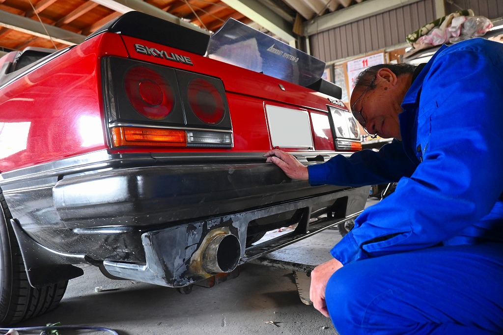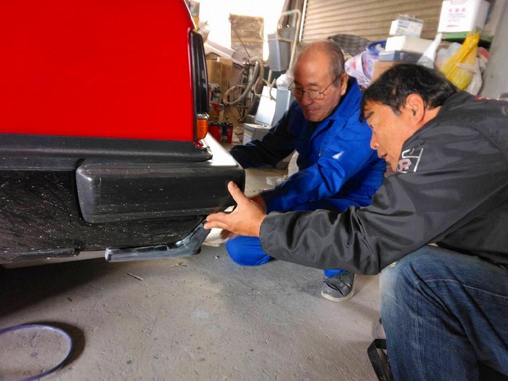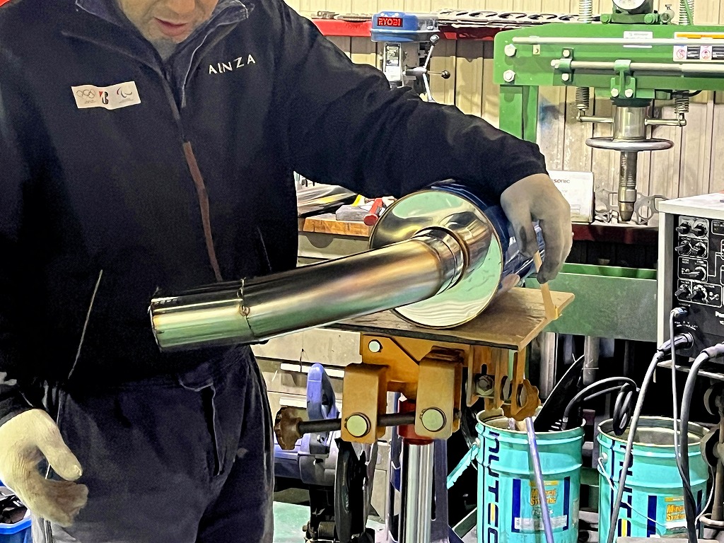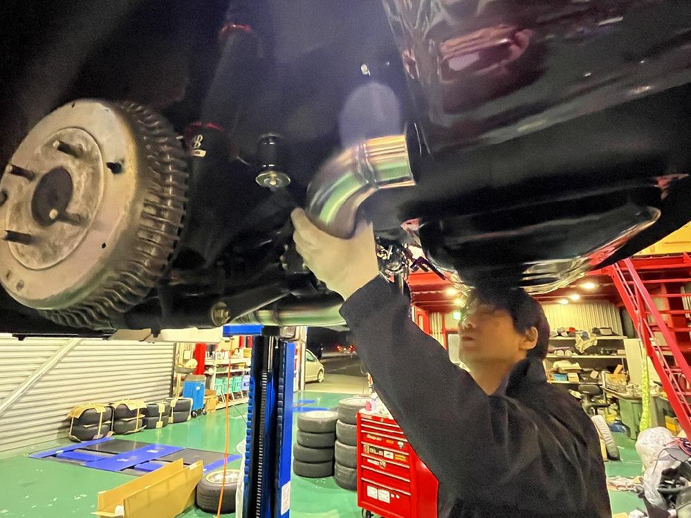 工場長が、ペンを使いマフラーの位置を罫書いて行きます(*^-^*)