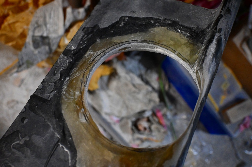 この目印に合わせてアンダースポイラーをマフラー形状に削って行きます(*^-^*)補強を考えてFRPも厚く加工しています。