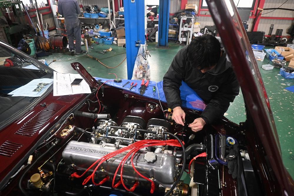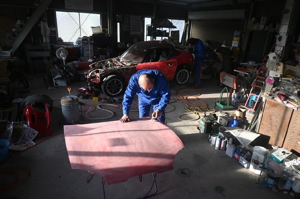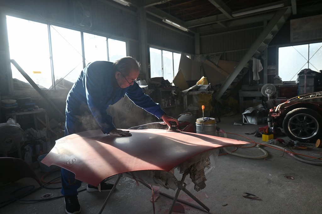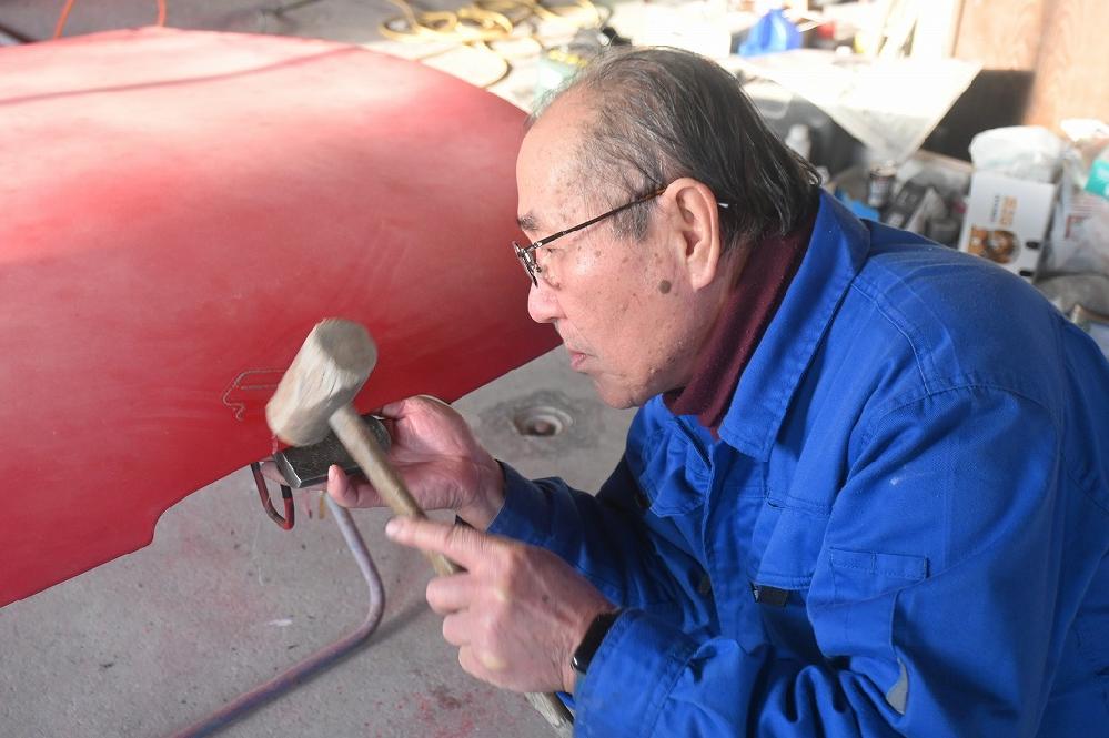 熟練マイスターが、ボンネットの小さな歪を修正して行きます。