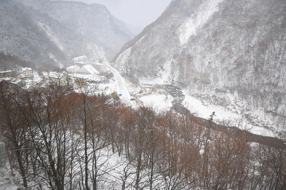 朝目が覚めてホテルの部屋から窓を見ると何と(;゚Д゚)雪で銀世界に変わっていました(^▽^;)秋の紅葉から一気に冬に変わりました。